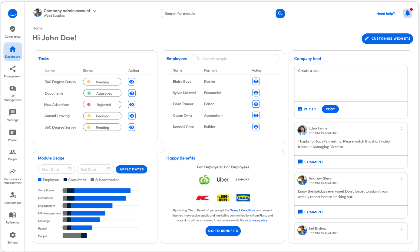 Happy HR is an easy-to-use cloud-based HR software created by HR professionals! We’ve done our bachelor’s in HR so you don’t have to. Having managed countless changes to the Fair Work Act 2009 and other legislations, we’ve ensured HR compliance for thousands of clients through our reliable online HR software.